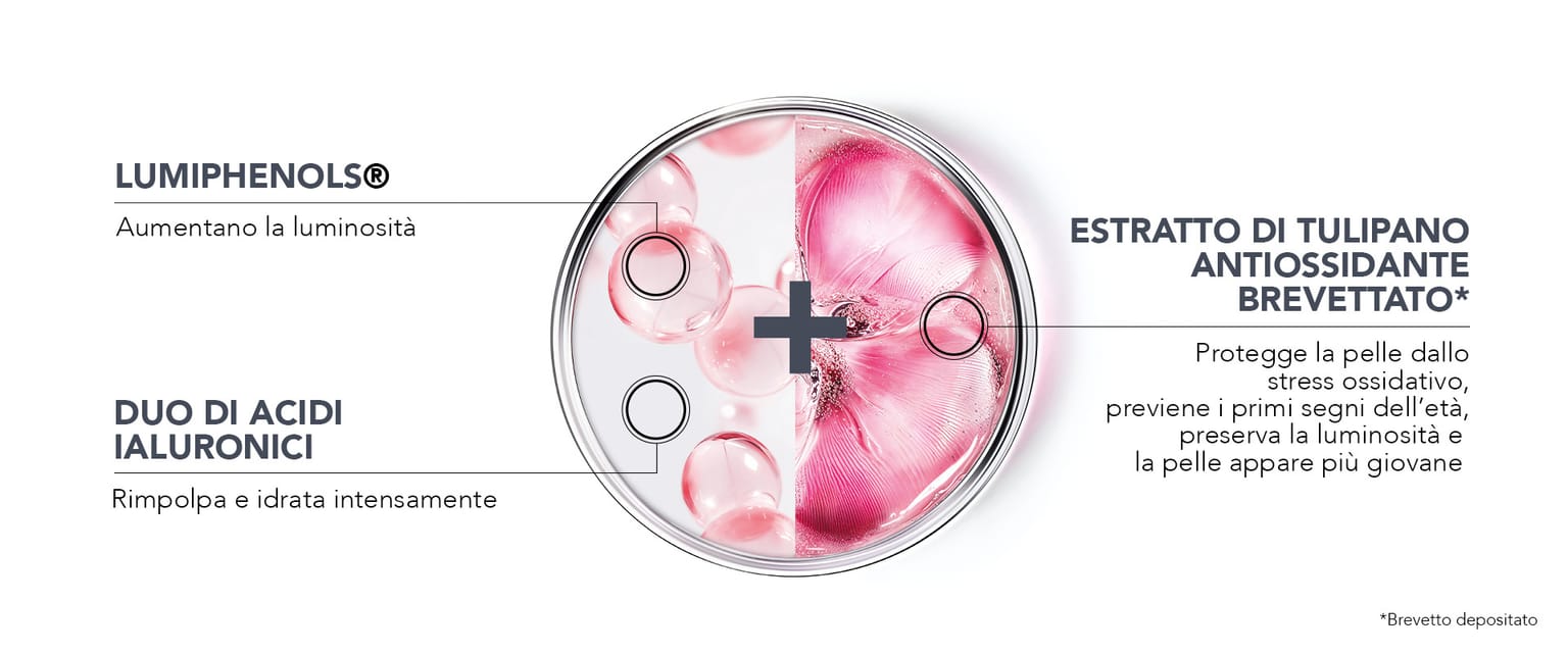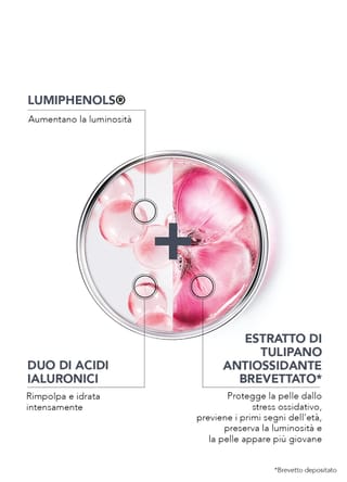 Formulata con acido ialuronico ed estratto di tulipano antiossidante brevettato*, questa linea idrata, rimpolpa e illumina la pelle. Fin dal primo utilizzo, aiuta a prevenire i primi segni dell'età. Per una pelle fresca e luminosa.