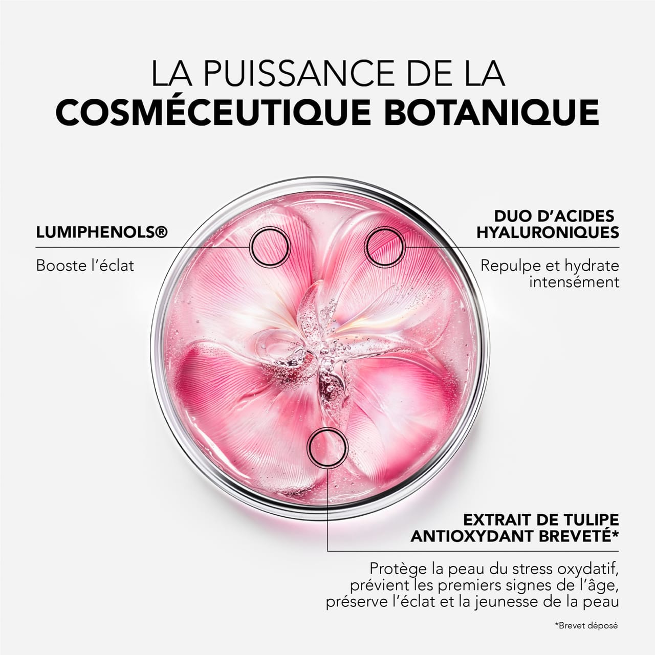 Al cuore della formula, i Lumiphénols®, booster di luminosità, correggono le macchie scure per un incarnato più uniforme. Il duo di acidi ialuronici a basso e alto peso molecolare idrata e rimpolpa, mentre l'estratto di tulipano antiossidante brevettato*, frutto di 12 anni di ricerca, preserva la luminosità, stimola le difese naturali della pelle e previene i primi segni dell'età.